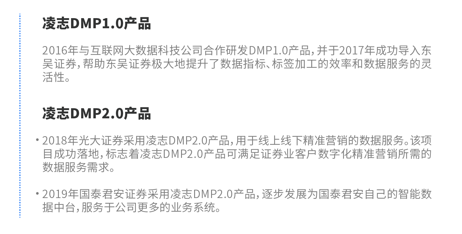 凌志大數(shù)據(jù)智能服務(wù)產(chǎn)品(DMP)歷經(jīng)幾年研發(fā)迭代、客戶驗(yàn)證,現(xiàn)已成為證券業(yè)成熟的大數(shù)據(jù)類產(chǎn)品。