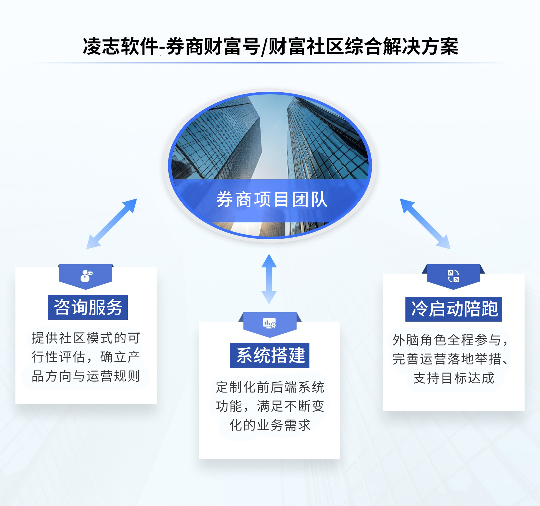 結(jié)合行業(yè)發(fā)展需求,凌志軟件基于對(duì)券商內(nèi)在條件、資源配置和獨(dú)特需求的深度分析,全面評(píng)估最適合的模式及可行性,為券商提供券商財(cái)富號(hào)/財(cái)富社區(qū)綜合解決方案,方案圍繞社區(qū)創(chuàng)建,從運(yùn)營(yíng)規(guī)劃、系統(tǒng)實(shí)施、上線啟動(dòng)到常態(tài)化過程,為券商順利啟動(dòng)和優(yōu)化社區(qū)服務(wù)保駕護(hù)航。